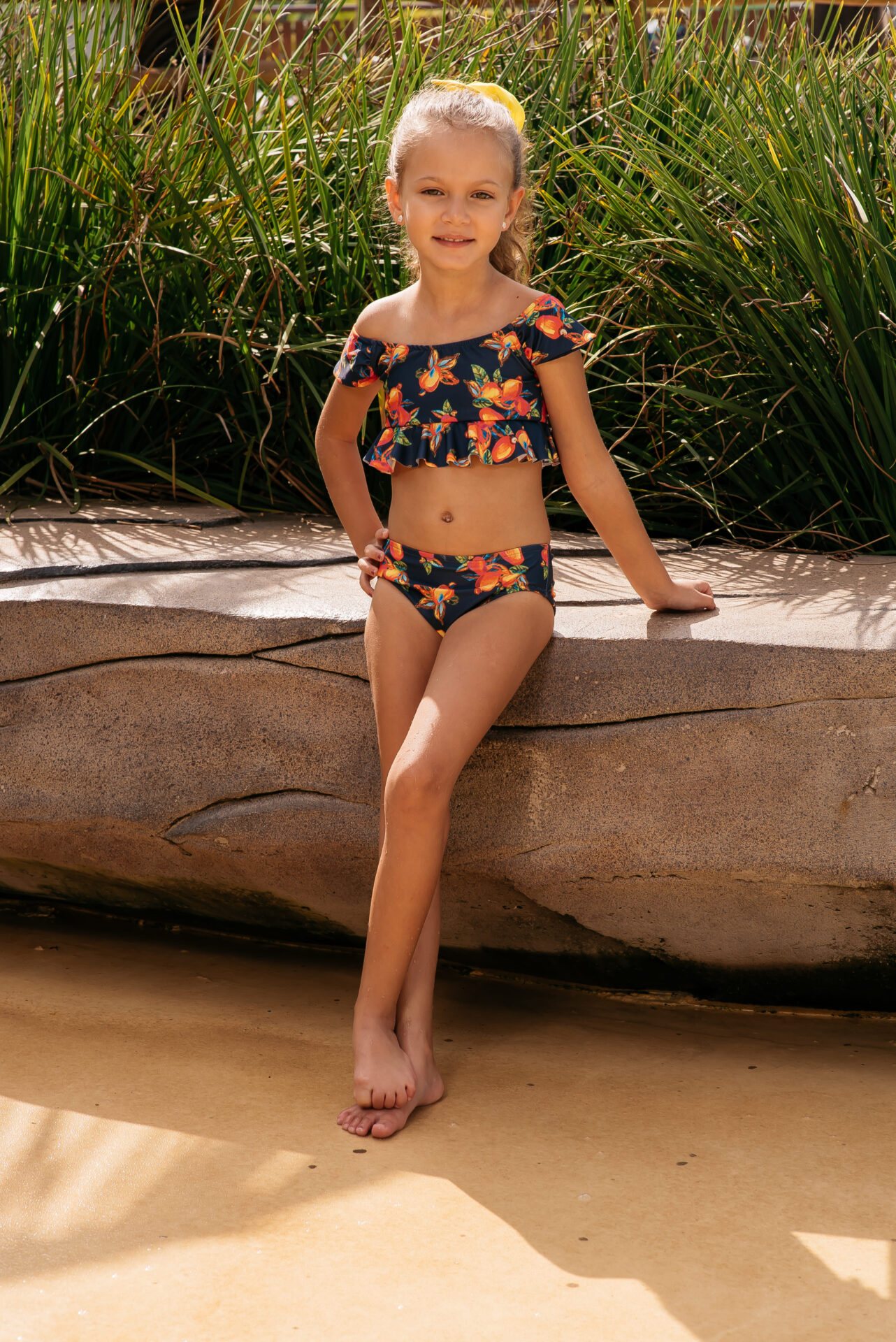 Biquíni infantil com estampa de cajus e top ciganinha, que traz um toque divertido e estiloso para os dias de sol. A modelagem confortável garante liberdade nos movimentos, enquanto os babadinhos na manga deixam o look ainda mais delicado e encantador para as pequenas aproveitarem o verão com charme.