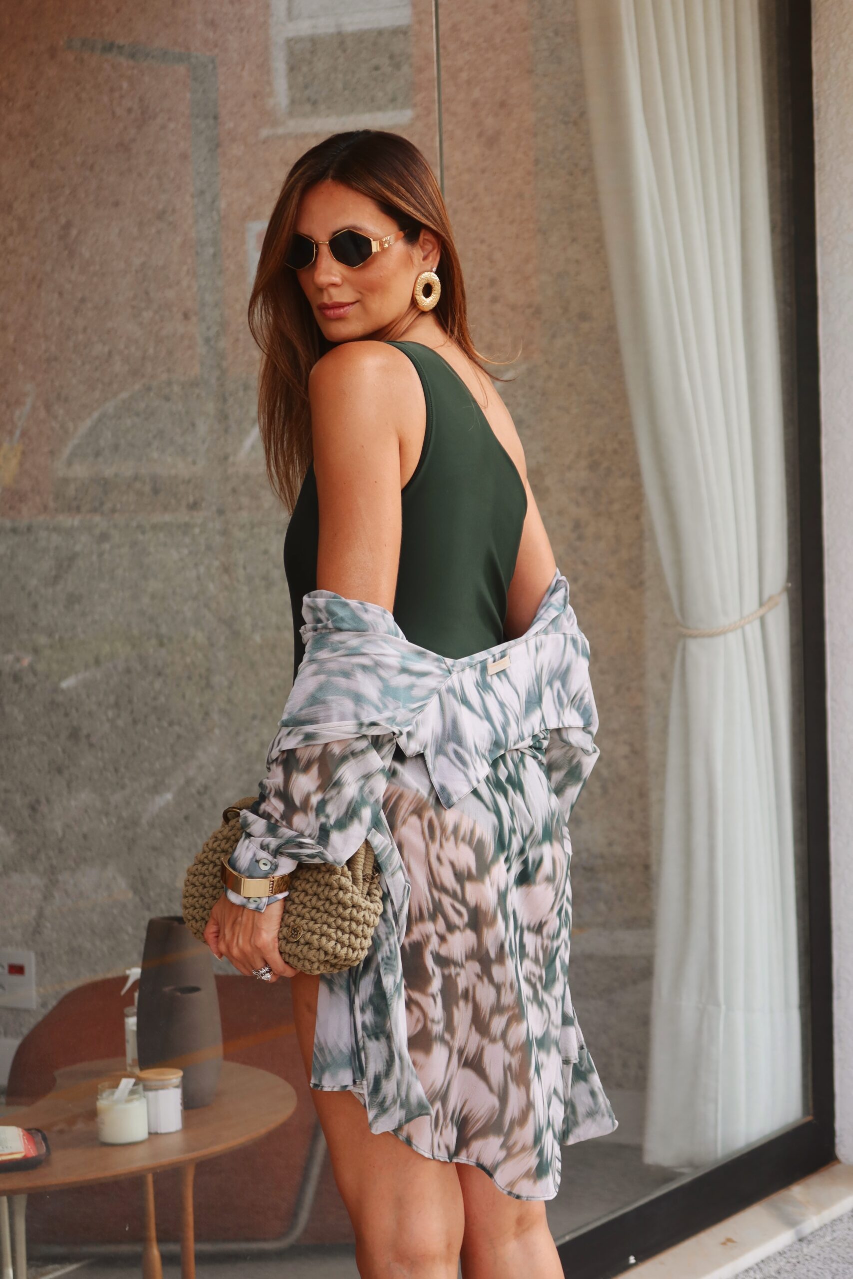 O Maiô verde assimétrico com argola tem modelagem de um ombro só e detalhe de argola orgânica dourada, que valoriza o colo e traz um toque sofisticado ao look.