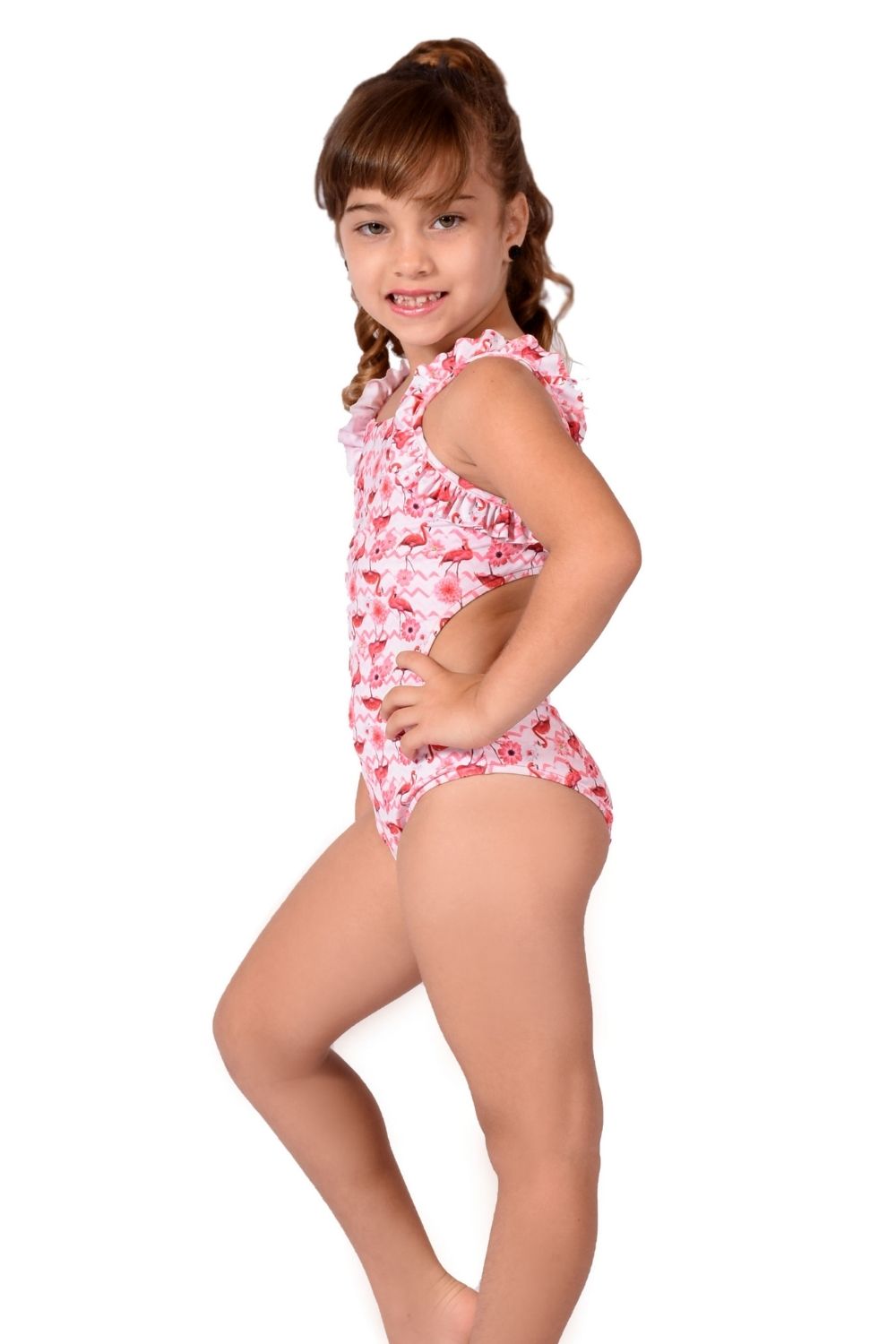 Maiô infantil confeccionado com proteção UV. O produto possui caimento levemente ajustado. As alças são largas e o decote é redondo.